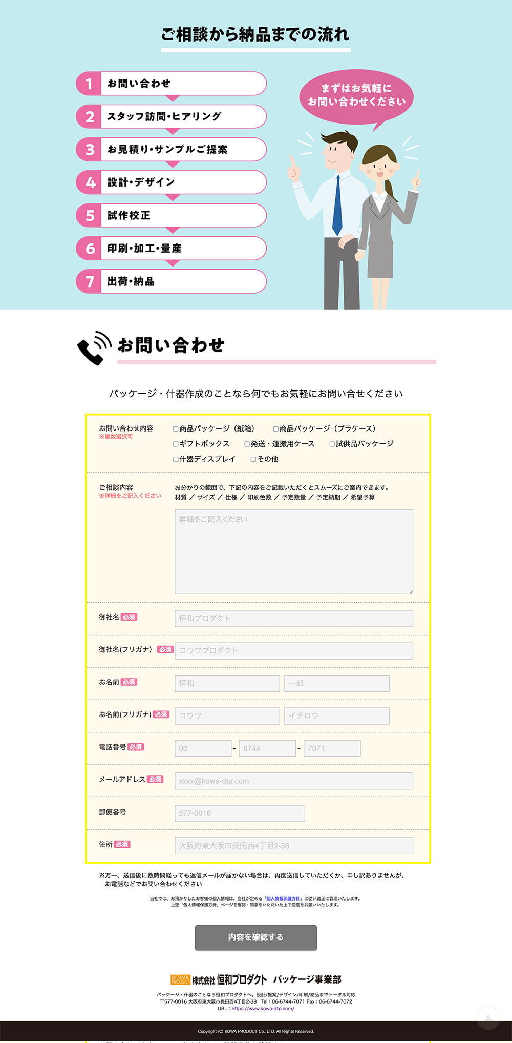 パッケージの写真やイラストをたくさん取り入れる事で、サービスの特徴がビジュアルでわかりやすく伝わるようにデザインしています。また、ご相談から納品までの流れや参考価格の一例などを掲載し、価格帯やスケジュール感を把握してから安心してお問い合わせいただけるような内容で構成しました。