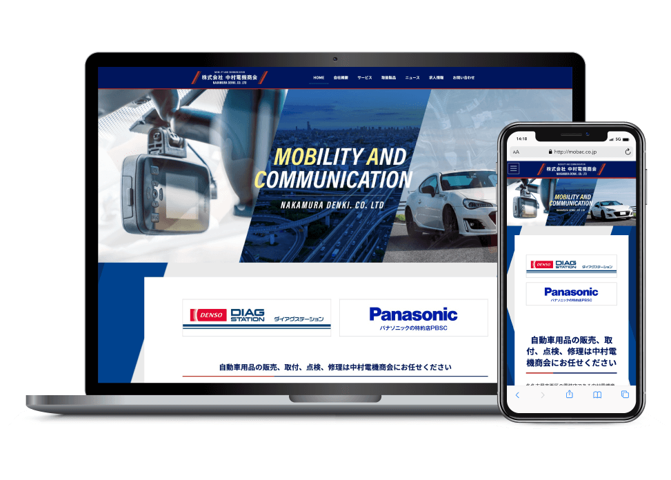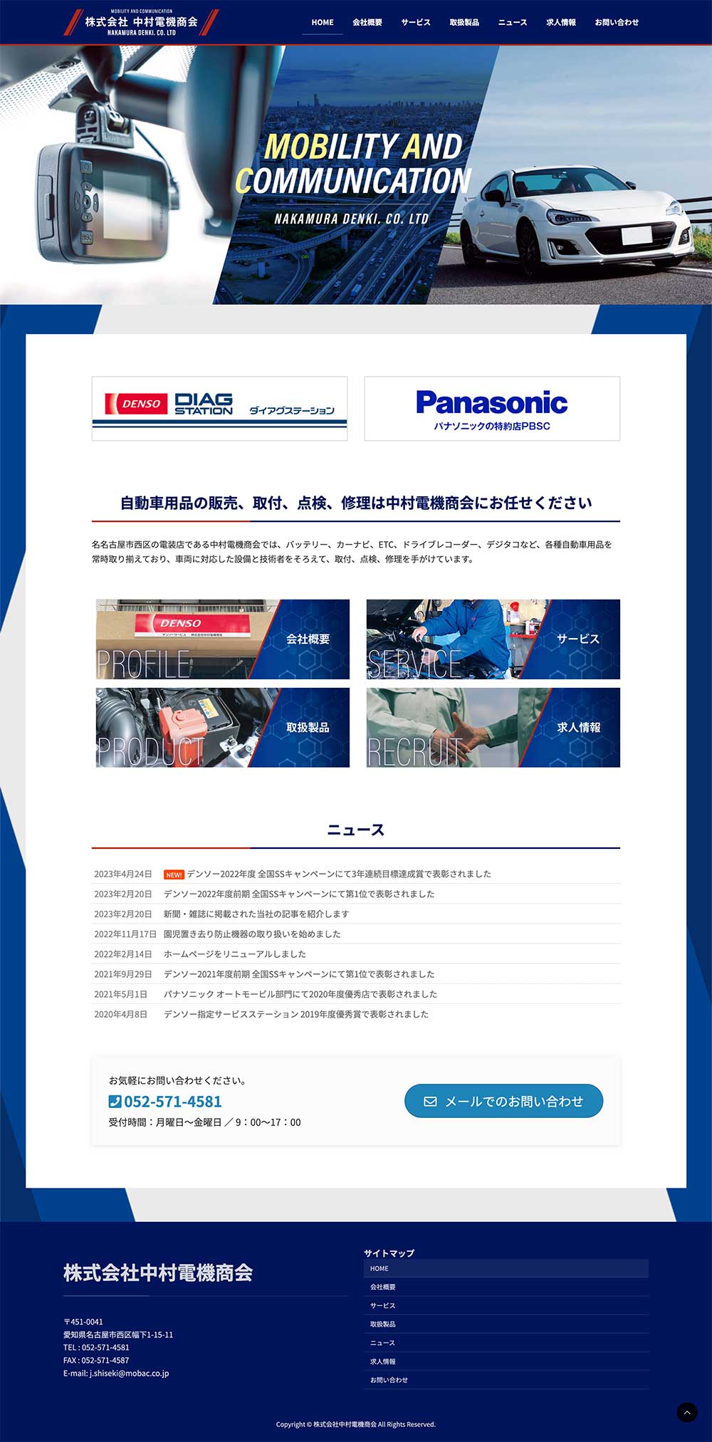 自動車用品の販売から取付、点検、修理を手掛けられているとのことで、メカニカルなデジタル感のあるデザインで作成しています。TOPページのスライド画像では取り扱っている商品イメージを表示し、自動車関連の会社だとパッと見てわかるように仕上げました。