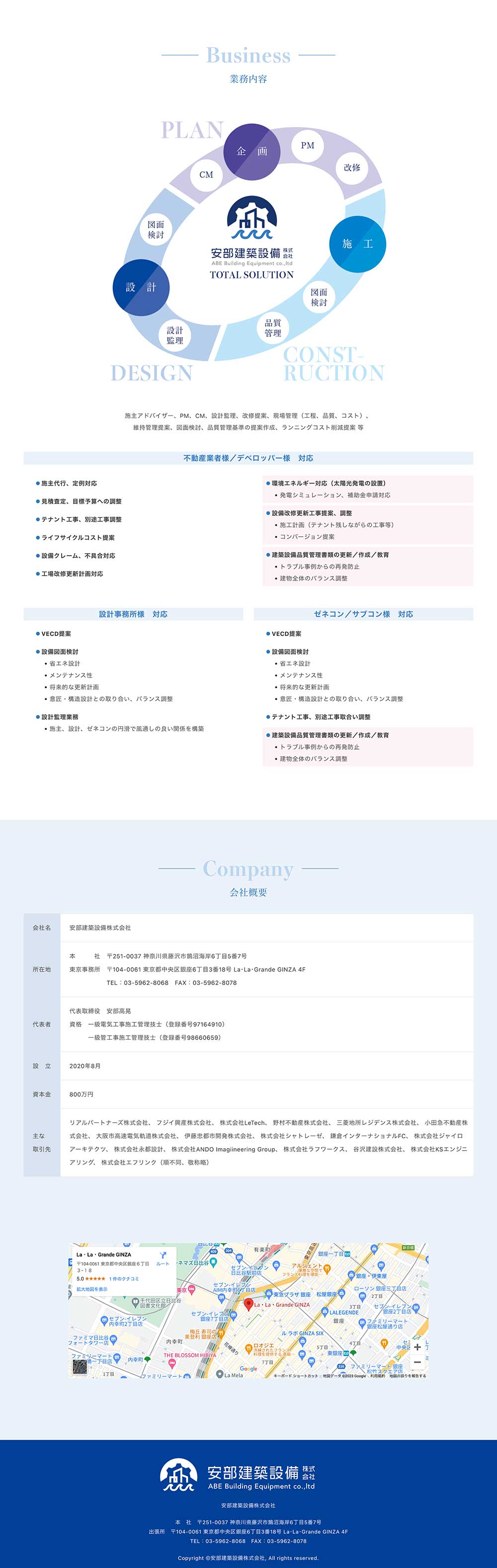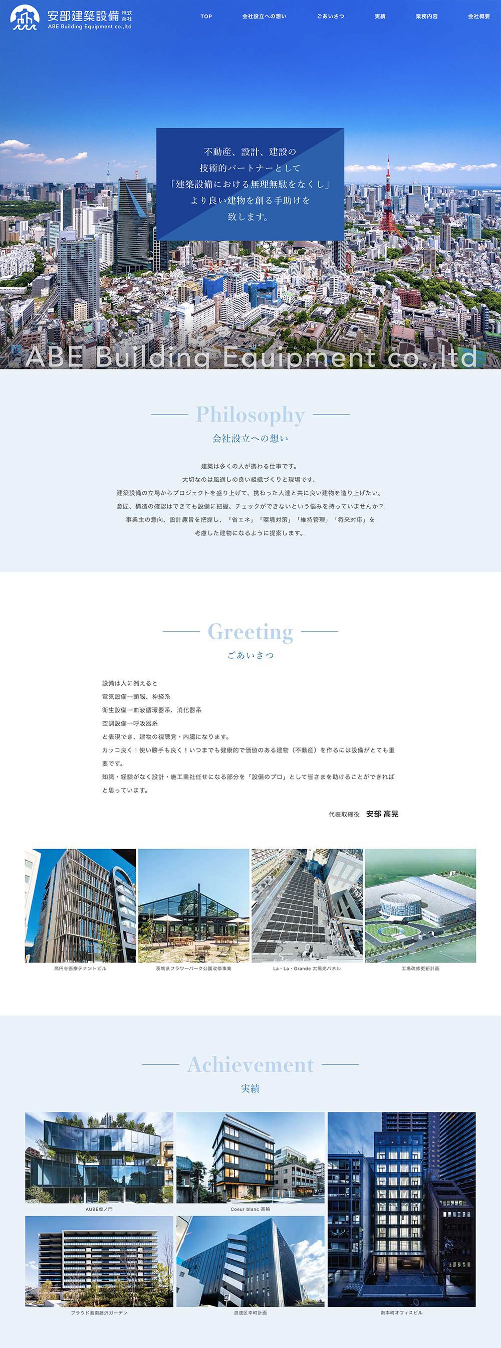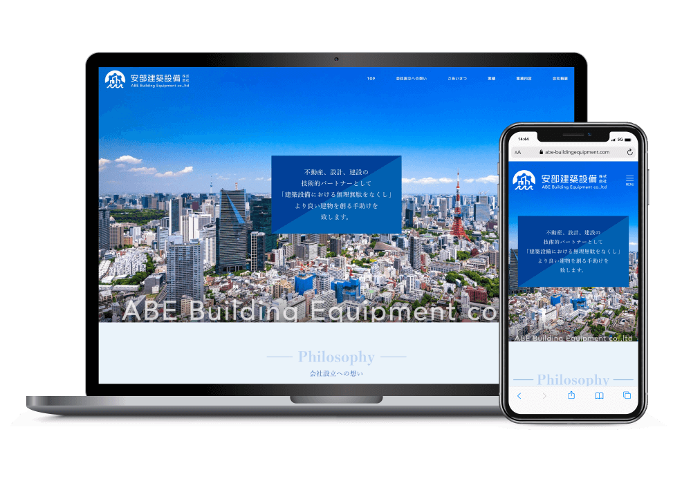 設備のプロとして、建設会社様などと連携し、さまざまな物件の制作に携わっているということでしたが、自社の技術力の高さから、これからは建築物の企画段階から加わることでもっと建築のクオリティを上げたいので、サイト自体はコンパクトで構わないが広がりのある信頼感のあるデザインにして欲しいとのご要望を受けて作成しました。1ページのサイトでありながら、そう感じさせないコーポレートサイトに仕上げました。